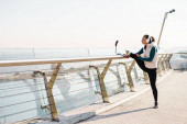 Młoda sportowiec z protezą robi ćwiczenia podczas pracy na moście miejskim