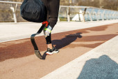 Zdjęcie "Młoda sportowiec z protezą działa podczas pracy na moście miejskim" może być wykorzystywane do celów osobistych i komercyjnych zgodnie z warunkami zakupionej licencji Royalty-free. Obraz jest dostępny do pobrania w jakości wysokiej rozdzielczości do 5760x3840.
