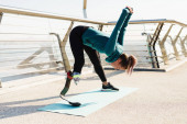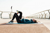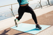 Młoda sportowiec z protezą robi ćwiczenia podczas pracy na moście miejskim