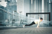 Zdjęcie "Młoda sportowiec z protezą robi ćwiczenia podczas pracy na moście miejskim" może być wykorzystywane do celów osobistych i komercyjnych zgodnie z warunkami zakupionej licencji Royalty-free. Obraz jest dostępny do pobrania w jakości wysokiej rozdzielczości do 5760x3840.