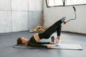 Młoda sportowiec z protezą trzyma słuchawki podczas treningu w pomieszczeniu
