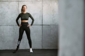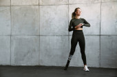 Młoda sportowiec z protezą pracuje w pomieszczeniach