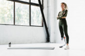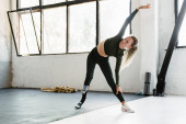 Młoda sportowiec z protezą robi ćwiczenia podczas treningu w pomieszczeniach