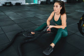 Młoda sportowiec z protezą wiąże sznurowadła podczas treningu w pomieszczeniu