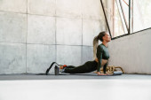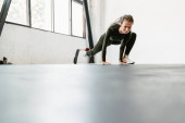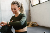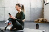 Młoda sportowiec za pomocą smartwatch i telefon komórkowy podczas siedzenia na macie w pomieszczeniach