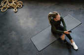 Młoda sportowiec uśmiechnięta i korzystająca z telefonu komórkowego podczas siedzenia na macie w pomieszczeniach