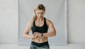 Młoda sportowiec uśmiechnięta i korzystająca ze smartwatcha podczas treningu w pomieszczeniach