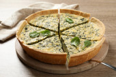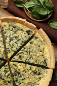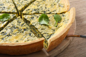 Talerz wyśmienitego placka szpinakowego na jasnym stole, zbliżenie