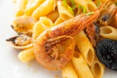 Pyszny makaron z owocami morza jako tło, zbliżenie