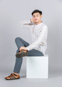 Studio strzał z tysiąclecia Azji przystojny młody mężczyzna model w casual strój siedzi na białym kwadratowym stołku patrzeć na aparat fotograficzny na szarym tle