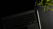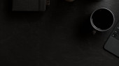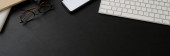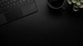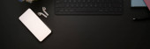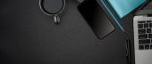 Nowoczesna koncepcja czarno-niebieskiego obszaru roboczego, czarne tło obszaru roboczego z klawiaturą, niebieskie akcesoria i przestrzeń do kopiowania. widok z góry, płaski