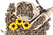 Mąka słonecznikowa w misce, olej w szklanym słoiku, nasiona w łyżce na serwetce jutowej, słonecznik na ciemnym drewnianym tle deski z góry