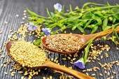 Nasiona słonecznika obrane łyżką na serwetce i na stole, olej w szklanym słoiku i słonecznik na tle drewnianej deski