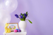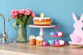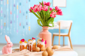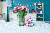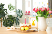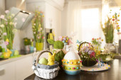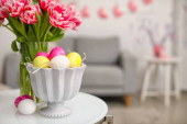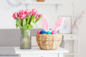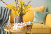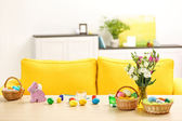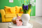 Kwiaty, kosz pisanek i królika na stole przy wygodnej sofie