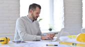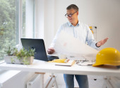 Architekt w niebieskiej koszuli stoi na stole roboczym z regulacją wysokości i pracuje