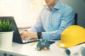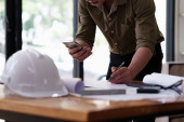 Zdjęcie "Architekt w niebieskiej koszuli stoi na stole roboczym z regulacją wysokości i pracuje" może być wykorzystywane do celów osobistych i komercyjnych zgodnie z warunkami zakupionej licencji Royalty-free. Obraz jest dostępny do pobrania w jakości wysokiej rozdzielczości do 5760x3840.