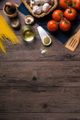Włoski makaron niegotowany, brązowe grzyby champignons, warzywa, ser i składniki do smacznego gotowania na starym tle tabeli kuchnia, ciemny styl, widok z góry. Baner spożywczy