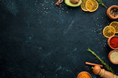 Zdrowe czyste jedzenie układu pokarmowego i diety koncepcja żywienia. Ananas, warzywa, suszone owoce, zielenina i inne składniki do przygotowywania sałatek na czarnym tle stołu z tabliczką, widok z góry, ramka