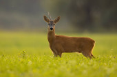 Jeleń Roe spogląda w kamerę na polu w ujęciu panoramicznym