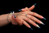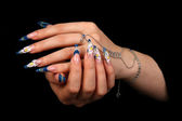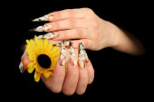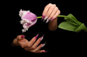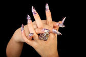 ludzkie palce z długim paznokciem i piękny manicure na czarnym tle