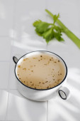 Domowej roboty zdrowy bulion kostny z przyprawami w białym kubku na drewnianej desce.