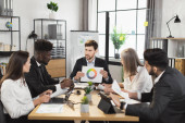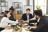 Różnorodna grupa partnerów biznesowych spotykających się w biurze