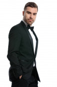 biznes człowiek się śmiać trzymając jedną ręką w kieszeni.