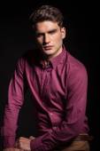moda mężczyzna siedzi na studio tło trzymając jego ręce toget