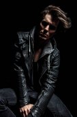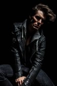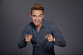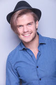 przystojny młody człowiek śmiechu podczas ustalania jego włosy.