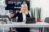 Biznes pani z siwymi włosami za pomocą telefonu komórkowego w biurze