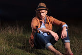 moda mężczyzna siedzi i trzymając rękę na jego podbródek