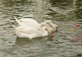 Łabędzie na stawie. Pływające łabędzie. Łabędzie w parku. Ptaki pływające