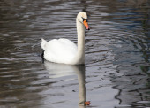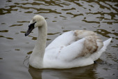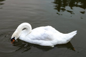 Łabędź na stawie. Pływający łabędź. Łabędź w parku. Ptak pływający
