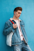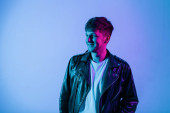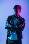 Przystojny, brutalnie modny młodzieniec w stylowej odzieży wierzchniej w skórzanej kurtce i białej koszulce w kolorowym studiu z neonowym różowym światłem.
