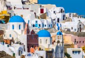 Gród Oia z jaskini domy na wyspie Santorini, Grecja.