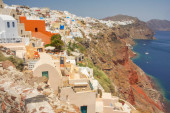 Kolorowe miejscowości Oia na skraju klifów caldera z wiatrakami w oddali na wyspy Thira (Santorini), Grecja.