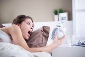 Krzycząca kobieta w łóżku z czerwonym budzikiem w dłoni