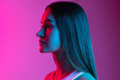 Kreatywny kobiecy portret z niebieskimi i różowymi światłami w studio. Modna kobieta w białej koszulce i swetrze z dzianin