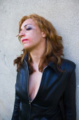 Ruda plus rozmiar kobieta z tatuażami w bieliźnie, studio shot