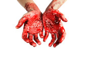Krwawa ręka ofiary maniaka, mordercy na szarym tle.