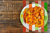 Zdjęcie "Gotowane ziemniaki z mięsem w czarnej misce. Ziemniaki z grzybami i marchewką. Gotowane grzyby i kurczak z ziemniakami. Jedzenie na czarnym drewnianym stole. " może być wykorzystywane do celów osobistych i komercyjnych zgodnie z warunkami zakupionej licencji Royalty-free. Obraz jest dostępny do pobrania w jakości wysokiej rozdzielczości do 5760x3840.
