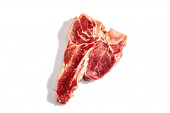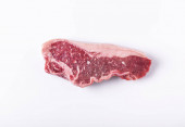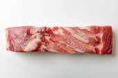 Czerwone mięso z bliska. Kawałek wieprzowiny odizolowany na białym tle. Przygotowanie do dań mięsnych. Kopiuj przestrzeń i wolne miejsce na tekst w pobliżu żywności.