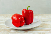 Papryka w białym talerzu. Warzywa na białym drewnianym stole. Pieprz na starej, nędznej desce. Kopiuj przestrzeń i wolne miejsce na tekst w pobliżu żywności.
