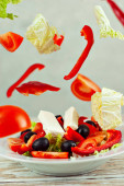 Zdjęcie "Sałatka z kapusty, pomidora, pieprzu, oliwek i sera w białym talerzu. Grecka sałatka z bliska na tle świeżych warzyw." może być wykorzystywane do celów osobistych i komercyjnych zgodnie z warunkami zakupionej licencji Royalty-free. Obraz jest dostępny do pobrania w jakości wysokiej rozdzielczości do 5760x3840.