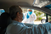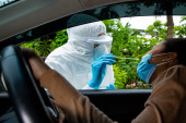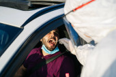 Bangi, Malezja - 15 lutego 2022: Młoda dziewczyna pobiera wymaz z PCR przez laboratorium jazdy.