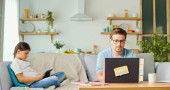 Rodzina na dystans społeczny Podczas izolacji kwarantanny Ze względu na Wirus Korony, Matka stara się pracować zdalnie, Córka ingeruje w pracę, Mąż jest zajęty w kuchni