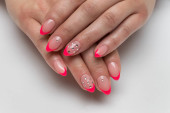 ślub francuski delikatnie różowy manicure z musujące konfetti na długich kwadratowych paznokciach