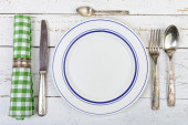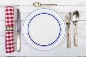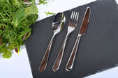 drewniane sztućce na serwetce z białych i czerwonych płytek