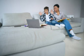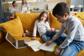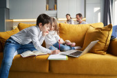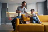 Zdjęcie "Chłopiec prosi swojego ojca o radę w sprawie pracy domowej." może być wykorzystywane do celów osobistych i komercyjnych zgodnie z warunkami zakupionej licencji Royalty-free. Obraz jest dostępny do pobrania w jakości wysokiej rozdzielczości do 5760x3840.