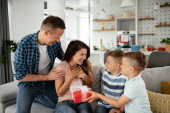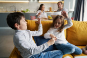 Zdjęcie "Radosna kobieta przynosi dzieciom dwie szklanki soku" może być wykorzystywane do celów osobistych i komercyjnych zgodnie z warunkami zakupionej licencji Royalty-free. Obraz jest dostępny do pobrania w jakości wysokiej rozdzielczości do 5760x3840.